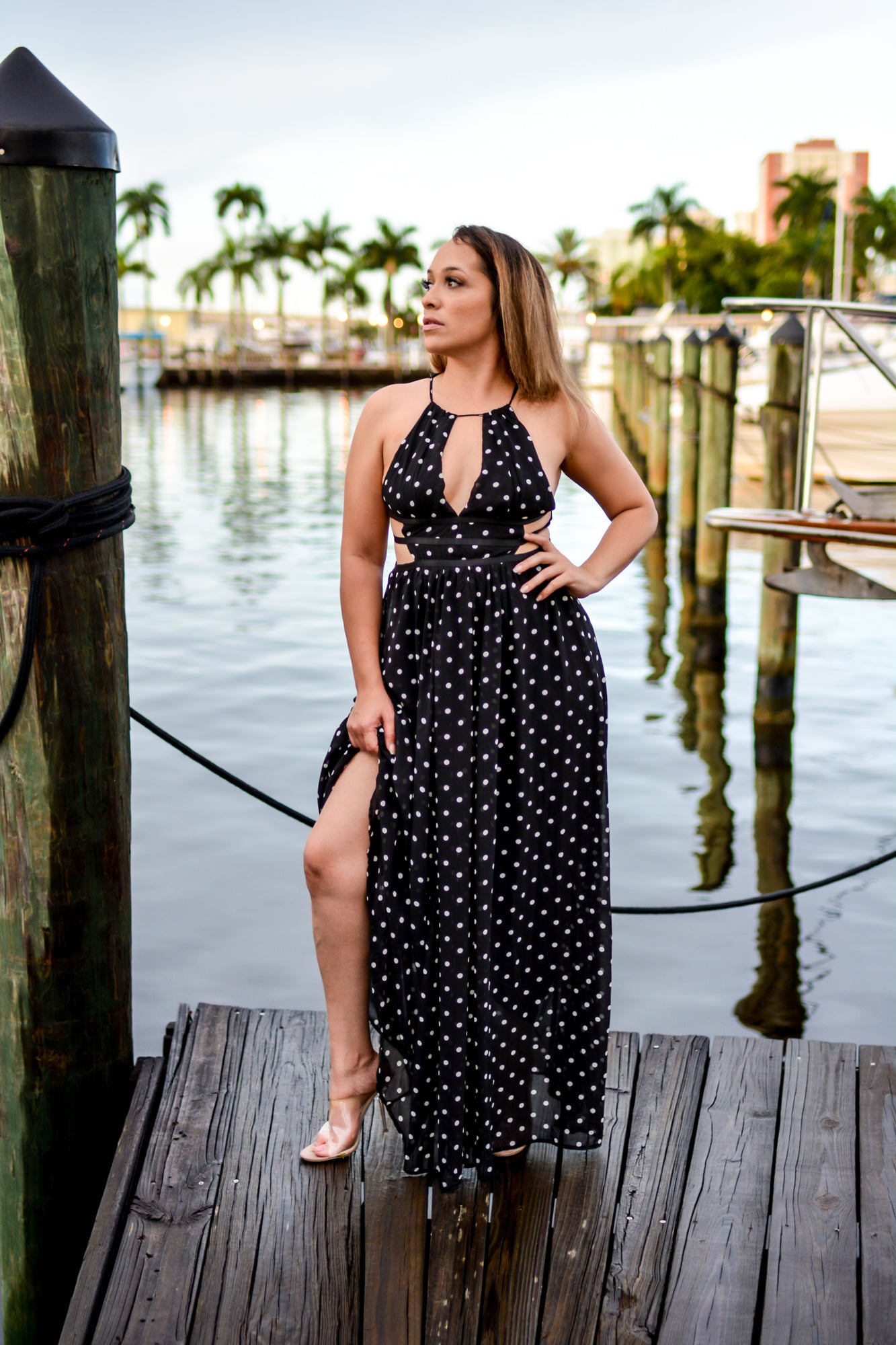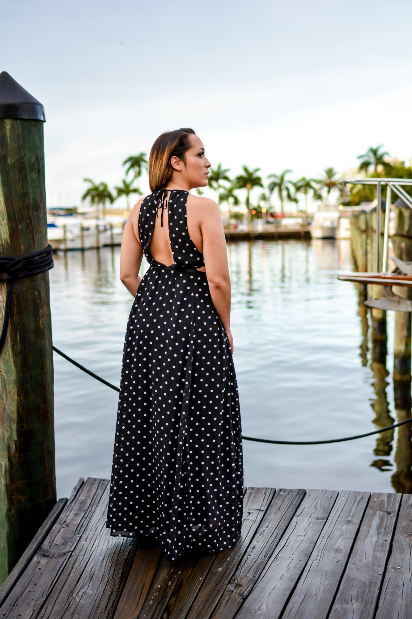 This stunning long polka dot dress has a full lining, tie back, and cutout side.