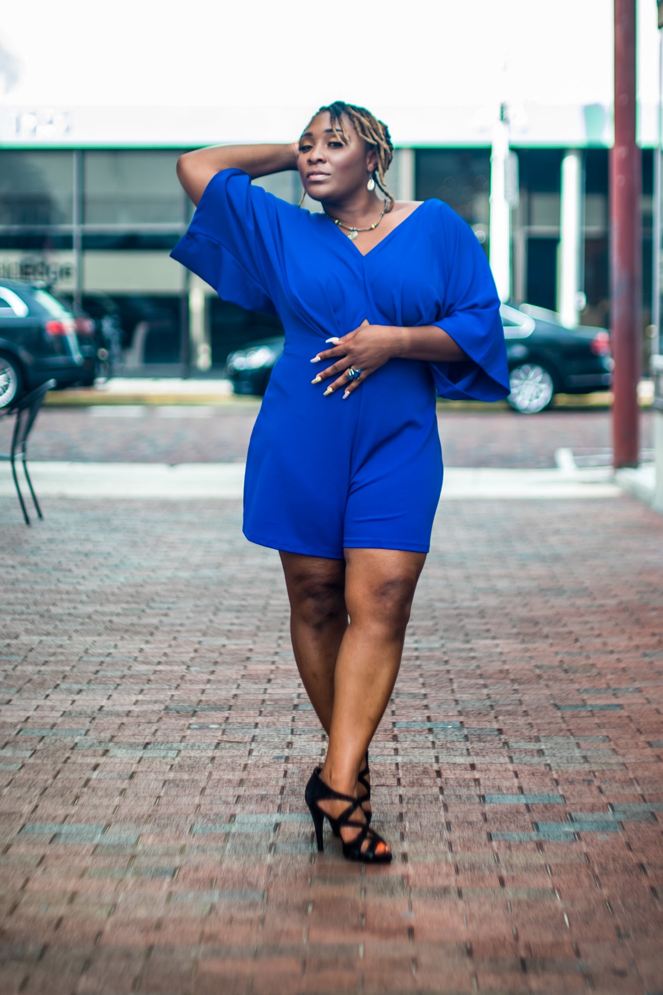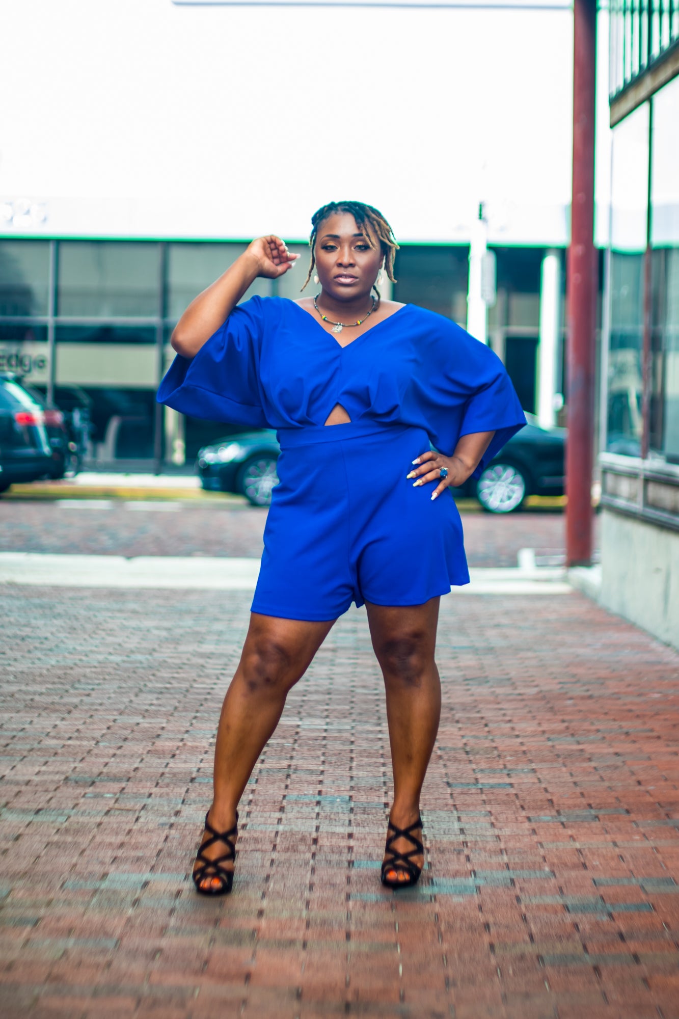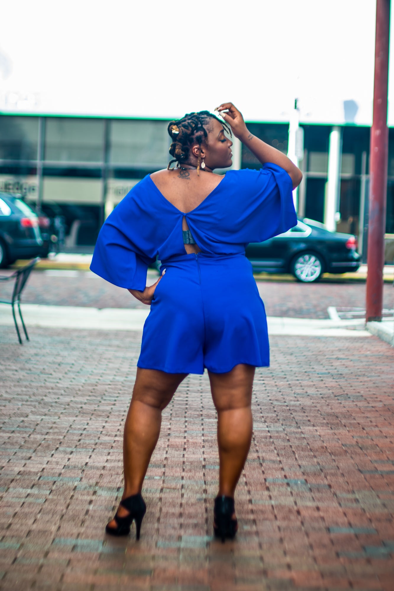 This romper features a stretchy fabric, wide loose bat-wing sleeves, peep midsection, and back, finished with a back zipper closure.