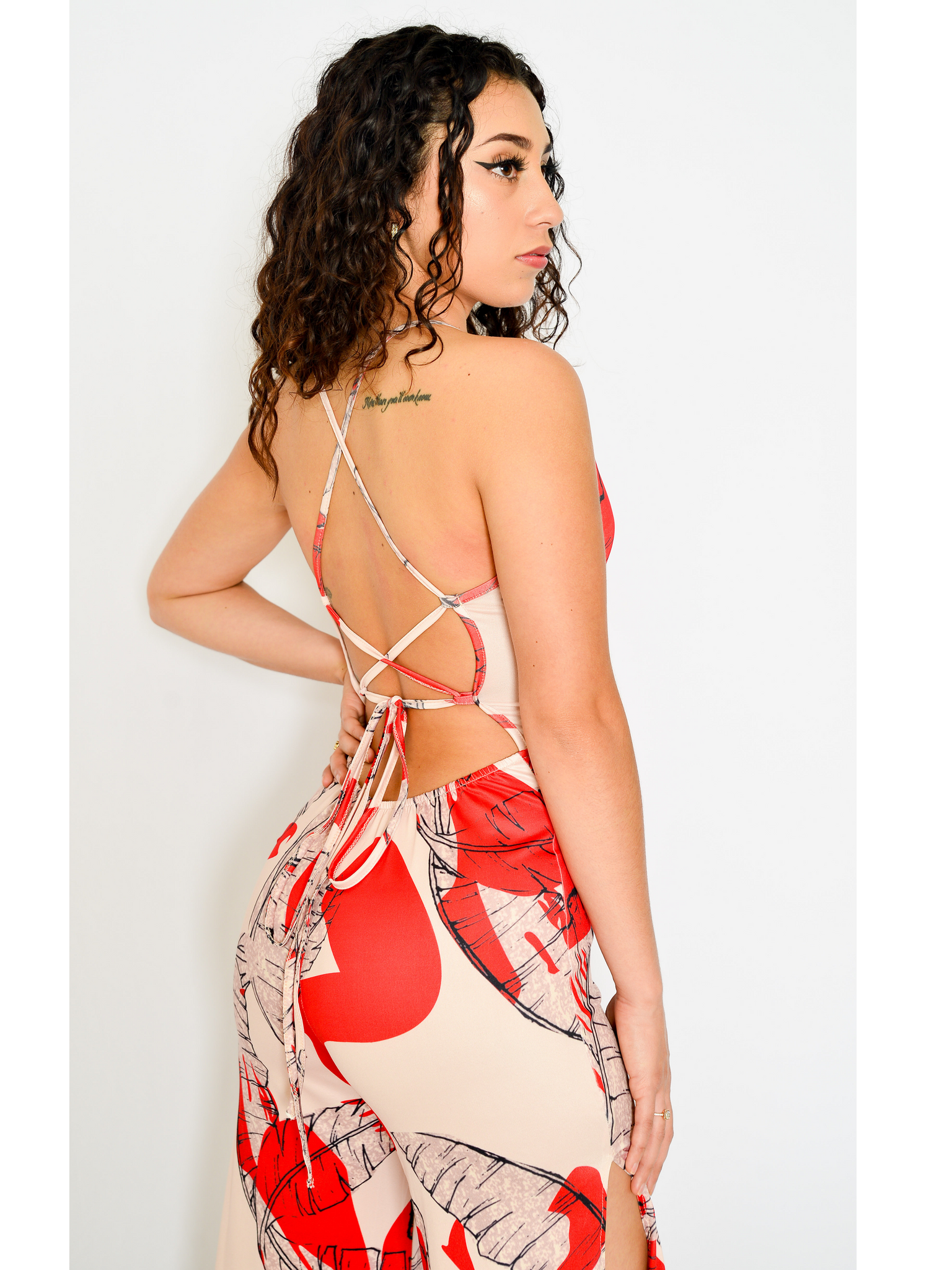 This one-piece jumpsuit features thin straps, deep v-neck, long wide-leg pants, side split, criss-cross back, and all-over leaf print.