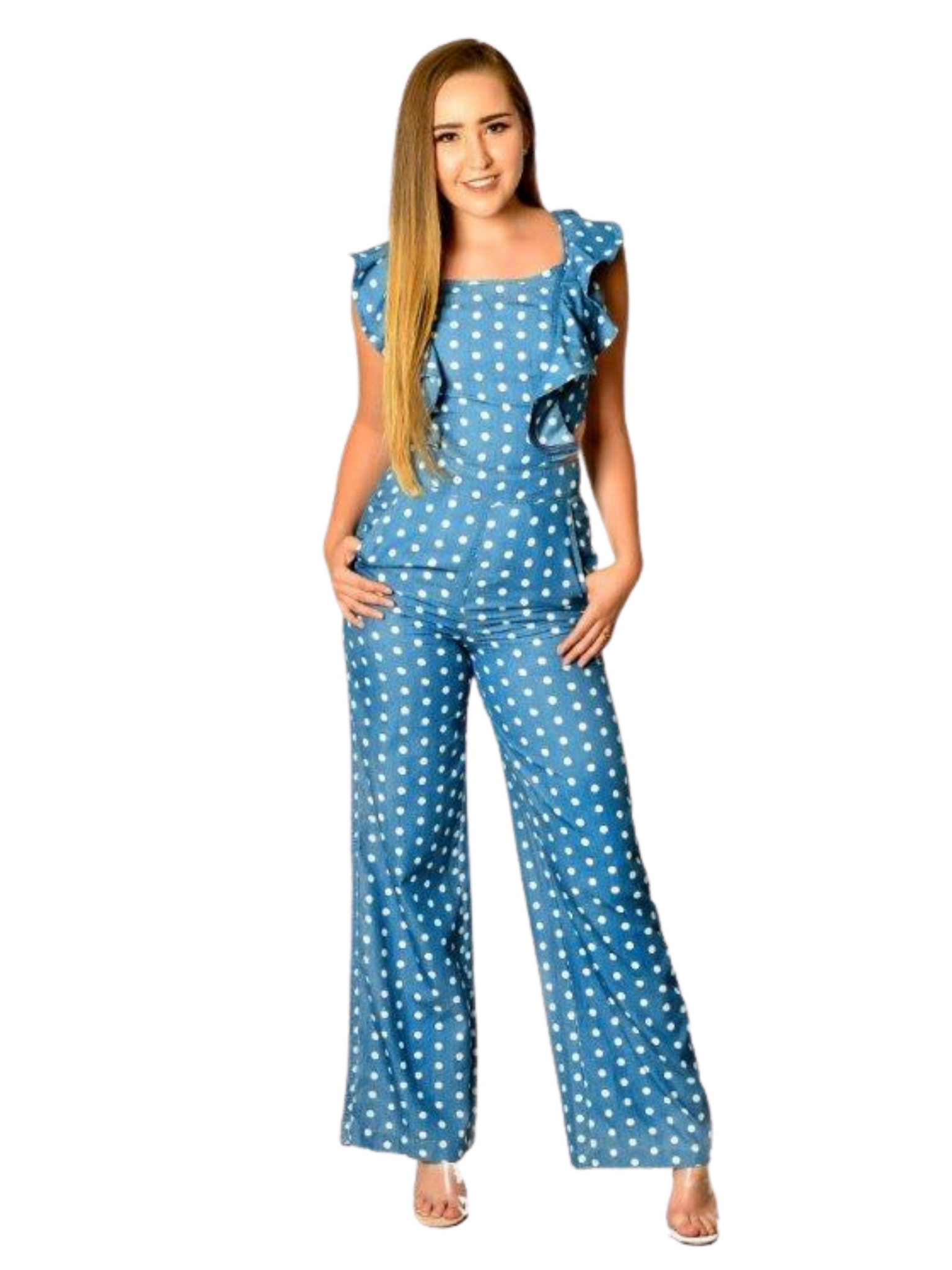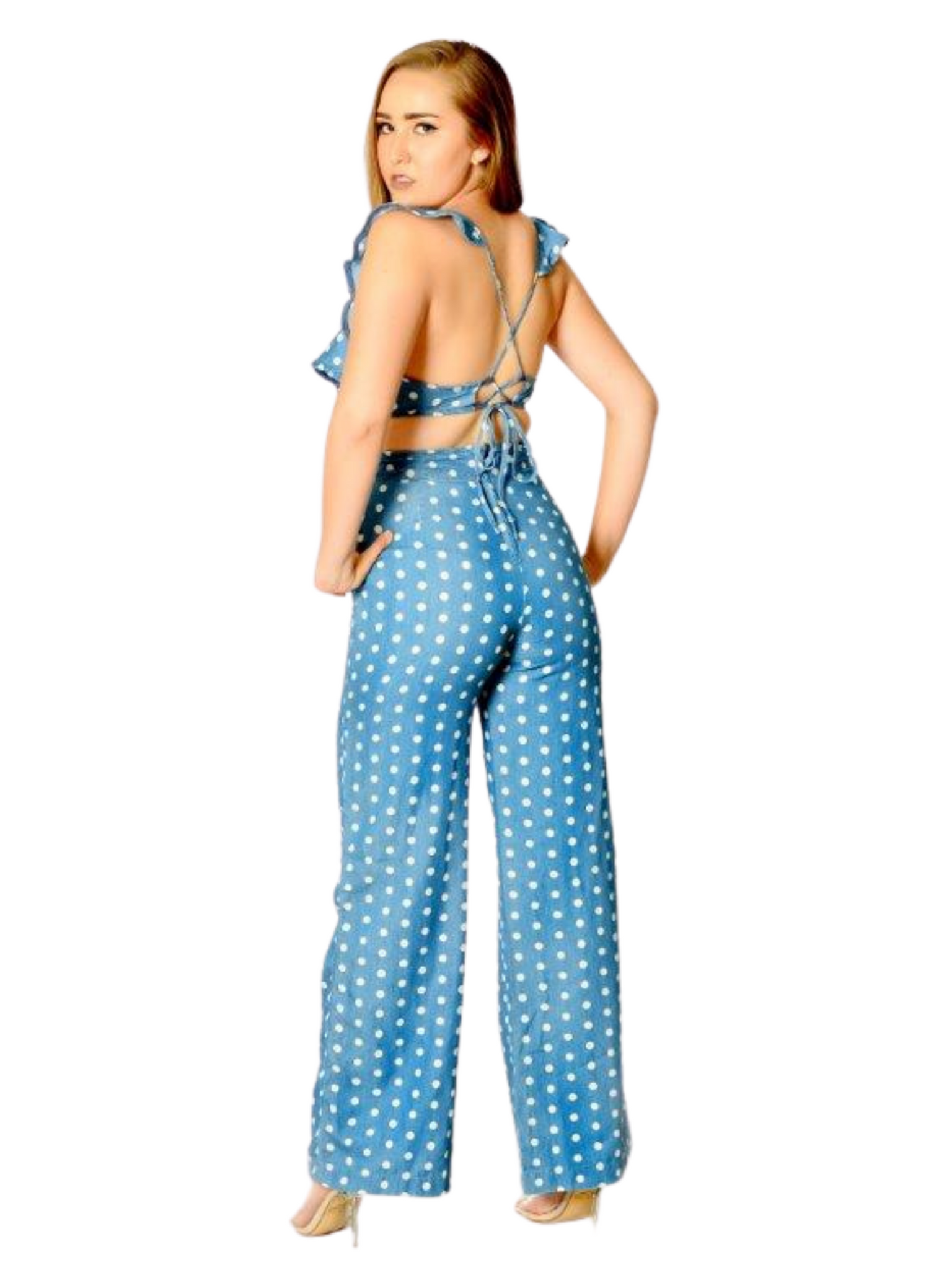 This jumpsuit features a non-stretch fabric, round neckline, open back, flare cap sleeves, wide bottoms, and side pockets, finished with a back self-tie strap, and a lower back zipper closure.