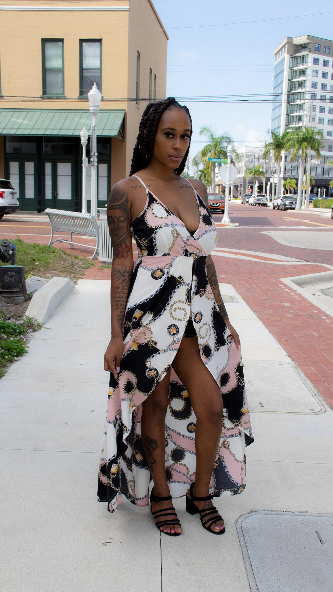 This gorgeous romper features a surplice neckline, adjustable straps, high-low overlay, and chain prints.