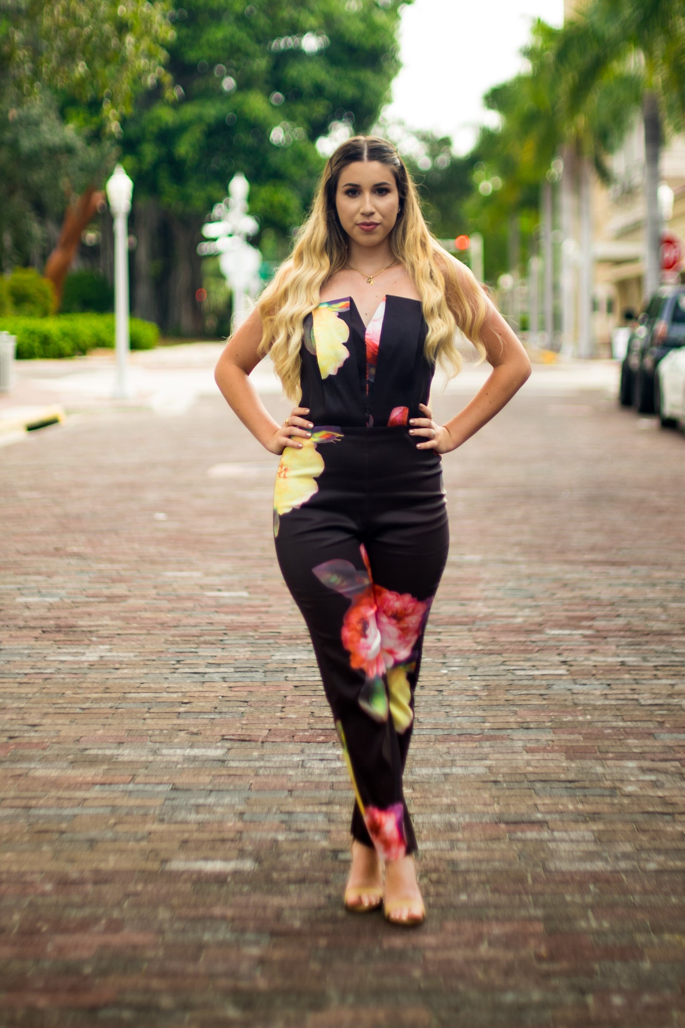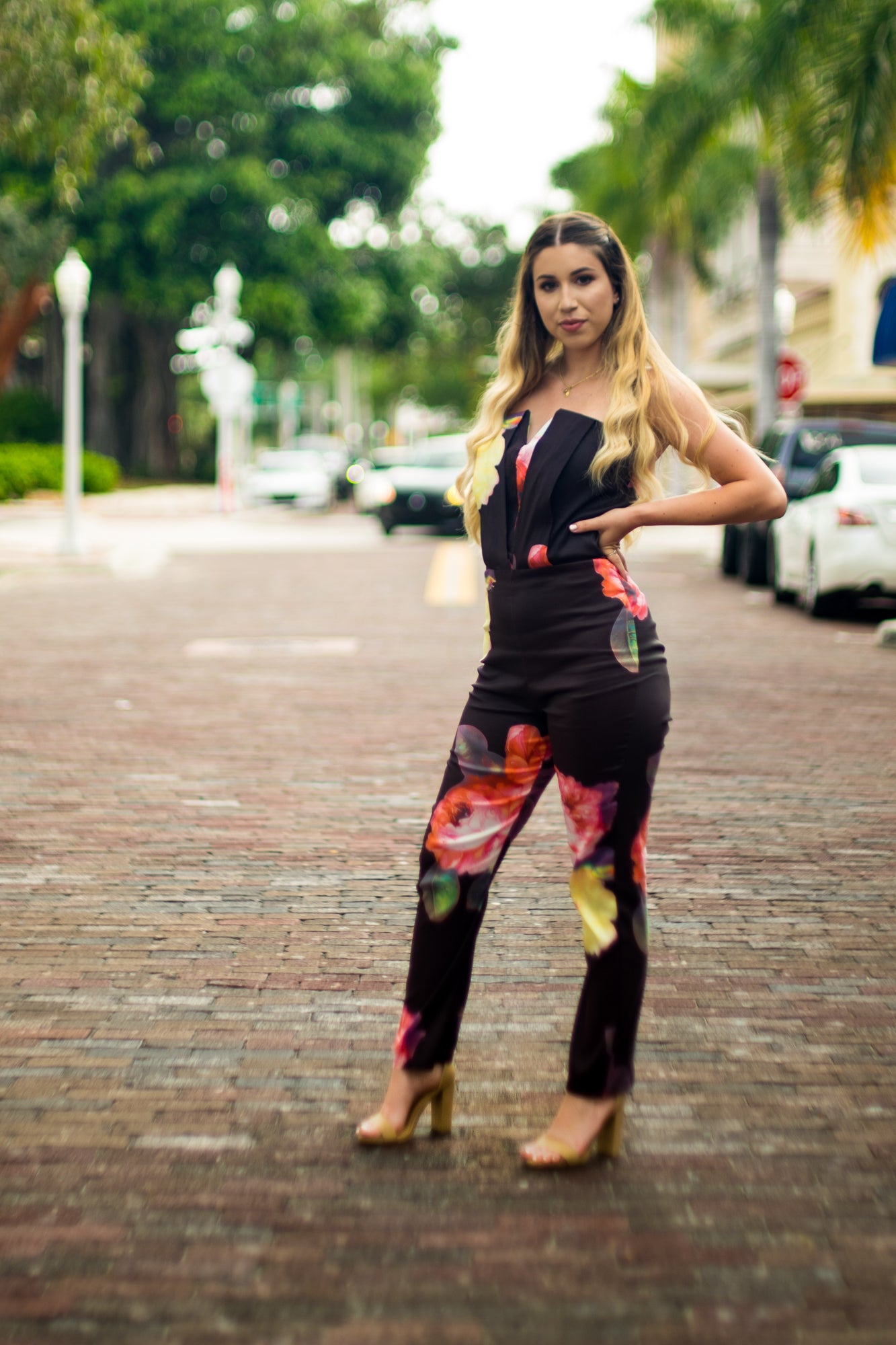 This jumpsuit will definitely stop a crow with its vibrant colors. Features off-the-shoulder v-neckline and straight leg.