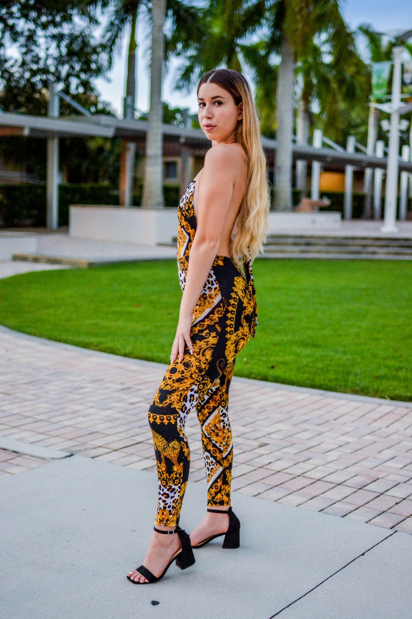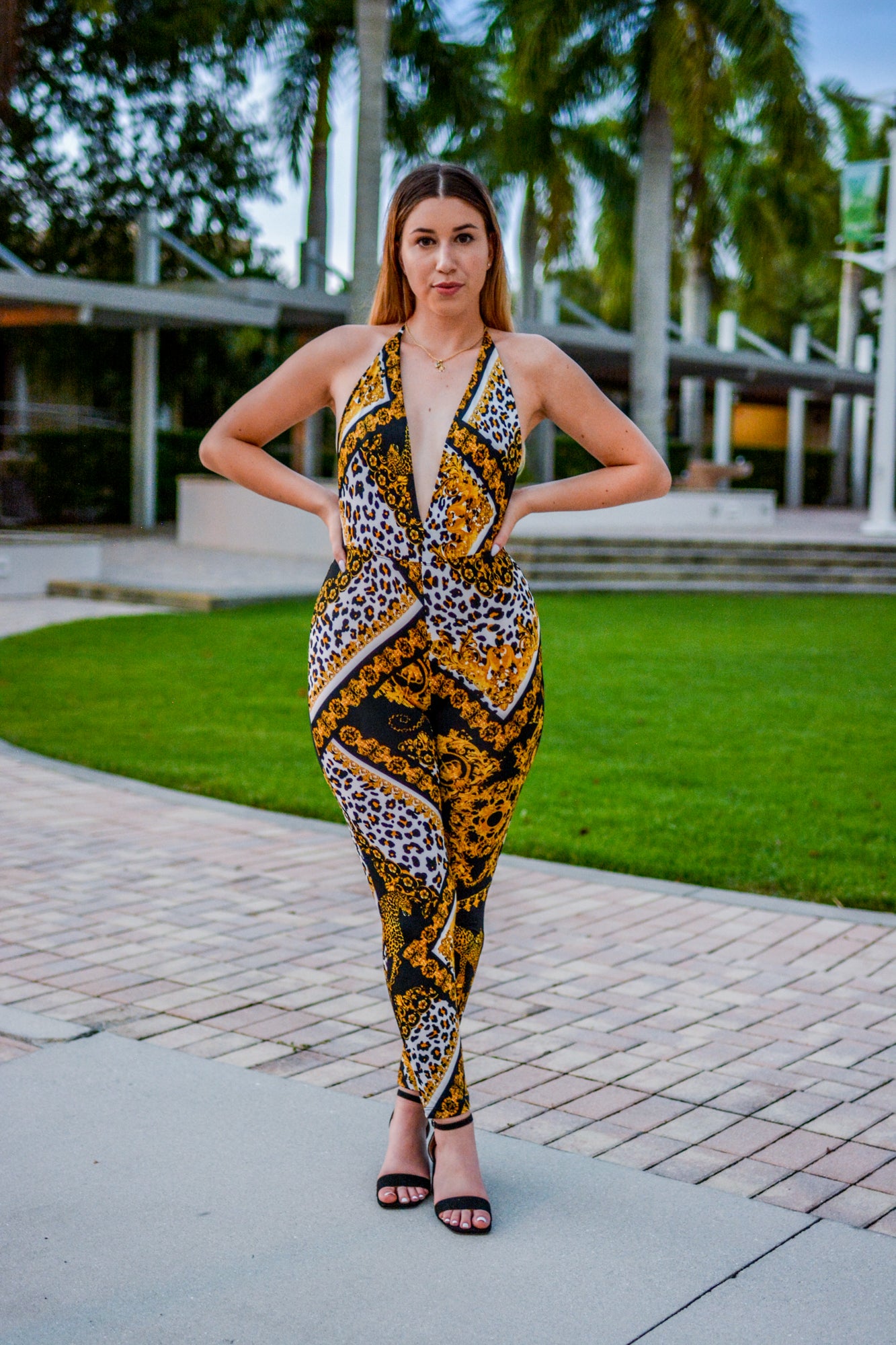 This sexy jumpsuit features a self-tie halter neck, v neck, and leopard print.