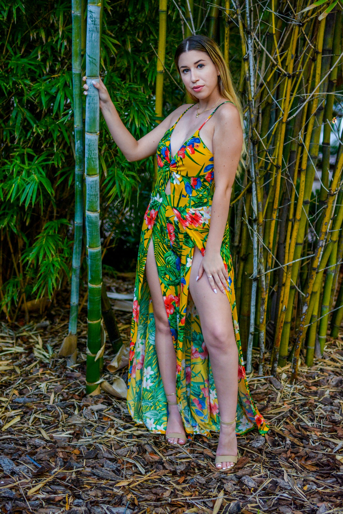 This tropical forest slit jumpsuit features a stretchy fabric, v-neckline, padded bust, and front high slit.