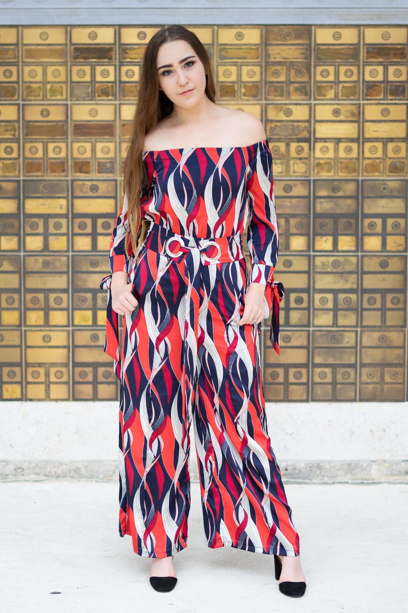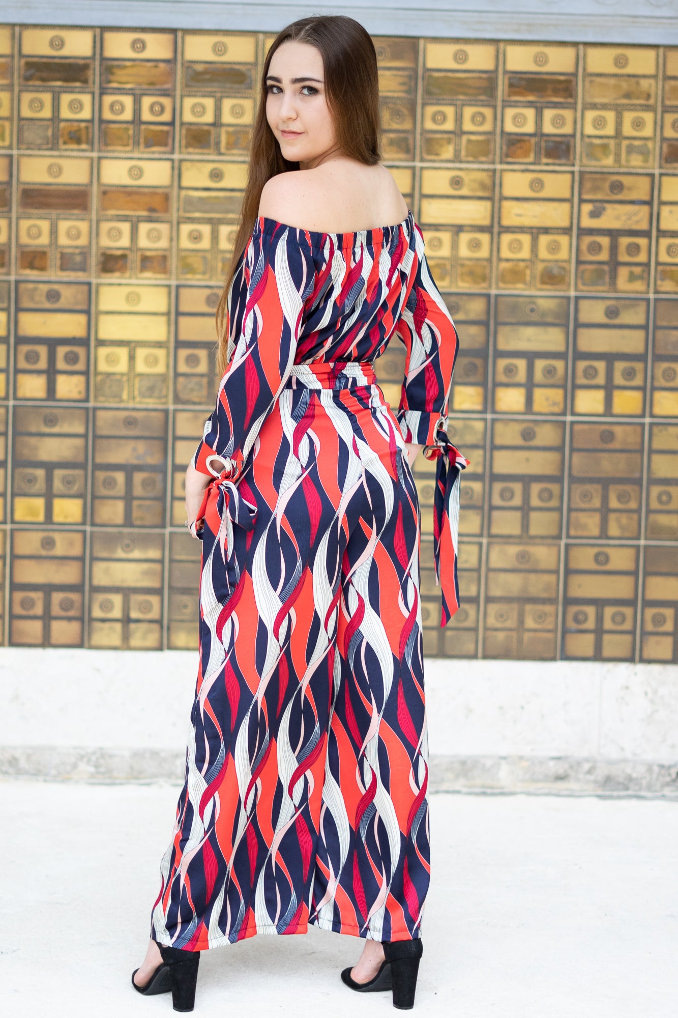 Take a look at our colorful jumpsuit is off the shoulder, has long sleeves, is self-tie, and has wide straight legs.